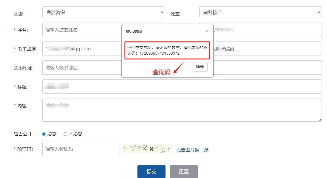 1、在我厅网站永利娱乐城-厅长信箱-我要写信页面中填写咨询内容,点击下方的“提交”按钮,弹出的小窗口中将提示如下信息:“信件提交成功,感谢您的参与,请记录您的查询码:XXX”,请留意并保存该信息。