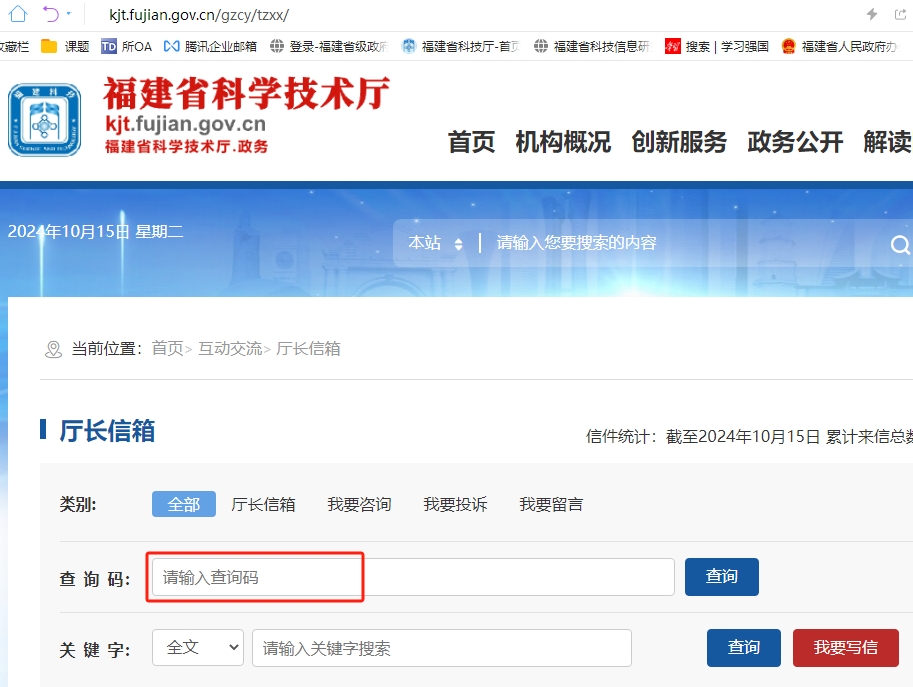 2、进入厅长信箱页面,在“请输入查询码”的输入框中输入已保存的咨询件查询码,点击“查询”即可查看咨询件的办理结果。