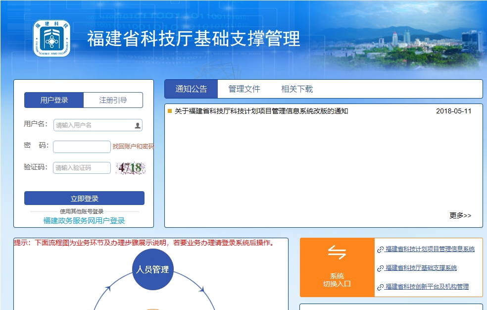 2、人员(专家)、单位使用原或现注册的账号和密码通过福建省科技计划项目管理信息系统永利娱乐城(//xmgl.ylofficial.net/showLoginPage.do?)上的系统切换入口登录"福建永利娱乐城 基础支撑系统"进行信息维护和信息变更申请,如信息处于起草或退回修改状态,请通过列表上的提交功能提交审核。