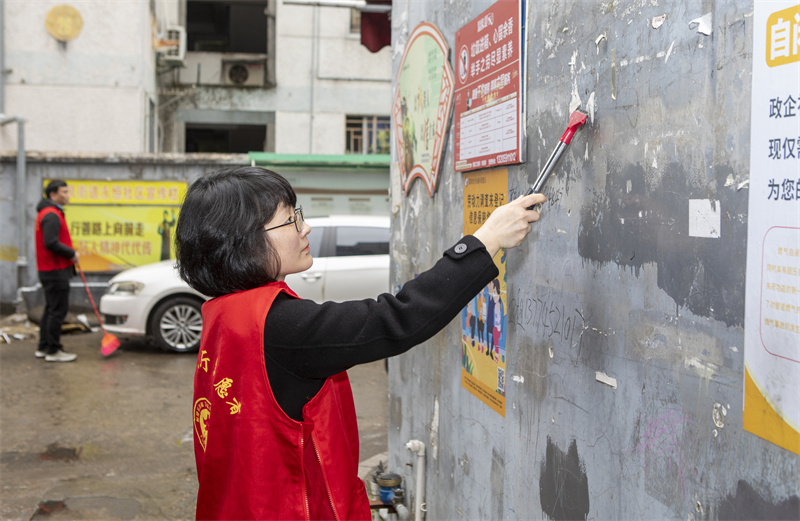 经过一个多小时的辛勤劳作,志愿者们仔细清理了社区 6 栋拆迁安置房的外墙与楼道上密密麻麻的“牛皮癣”小广告,让原本杂乱的墙面与楼道重焕整洁。同时,对长达 100 余米的社区商业街卫生死角进行了全面整治,将堆积的垃圾逐一清理,并妥善转运了残留的生活垃圾,成功为社区居民打造出一个整洁干净的生活家园。