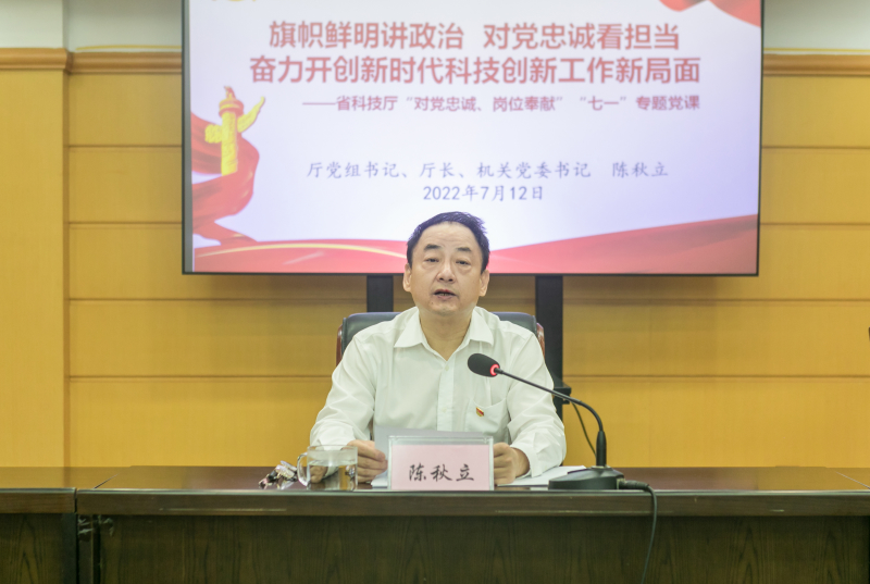 为庆祝中国共产党成立101周年,7月12日上午,永利娱乐城 党组书记、厅长、机关党委书记陈秋立同志围绕“忠诚在心、岗位奉献”主题,结合学习《闽山闽水物华新——习近平福建足迹》和永利娱乐城 工作实际,以《旗帜鲜明讲政治、对党忠诚看担当,奋力开创新时代科技创新工作新局面》为题,为厅机关全体党员干部讲授了一堂对党忠诚教育专题党课。厅党组成员、副厅长黄舒同志主持党课报告会。
