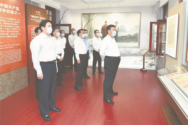 6月25日,习近平、李克强、栗战书、汪洋、王沪宁、赵乐际、韩正等在北大红楼参观“光辉伟业 红色序章——北大红楼与中国共产党早期北京革命活动主题展”。