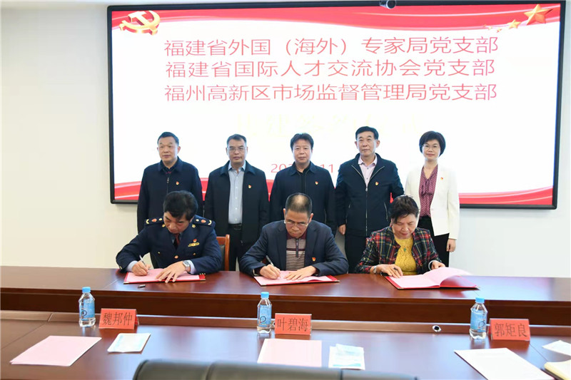 福建省外国(海外)专家局党支部书记郭矩良、福建省国际人才交流协会党支部书记吴步绸、福州高新区市场监管局党支部书记林文国分别代表党支部签署了三方共建协议书,以共建引领党建发展,以先进基层党组织建设为目标,围绕外国专家引进、科学普及、市场监督、科技人才服务等工作,畅通单位业务互补、资源共享机制,逐步形成组织联建、党课联上、活动联办的党建引领发展新格局,为经济社会发展提供强有力的科技人才支撑,共同推进科技事业和市场监督工作更上新台阶。