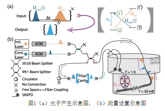 多功能单光子源的光子产生和测量原理如图1所示,图1-a是光子产生示意图,SiV自旋的四能级系统由交替初始化连贯驱动(Ωinit)和光子产生(Ωcont)光脉冲,产生一系列时间形状的光子,这些光子被过耦合的纳米光子腔有效地收集。图1-b是光子测量设置示意图,包含SiV的纳米光子腔在稀释冰箱中冷却至50mK,并进行泵浦以连贯地产生单个任意形状的光子。使用声光调制器对泵浦脉冲进行整形,并通过自由空间法布里—珀罗腔从单光子流中滤除泵浦光。该技术有望为未来的网络和通信技术提供增强的安全性、先进的信息处理能力、远距离通信能力以及更好的数据隐私。