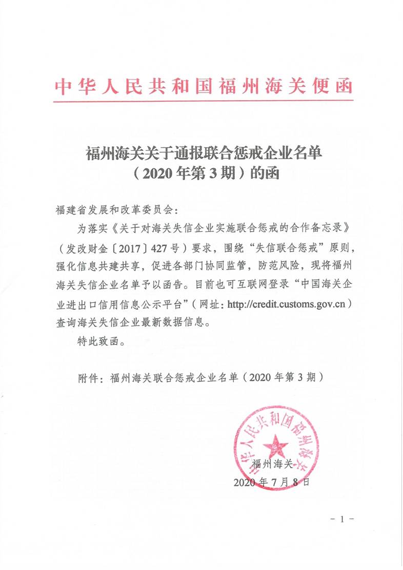 福州海关联合惩戒企业名单(2020年第3期)的函